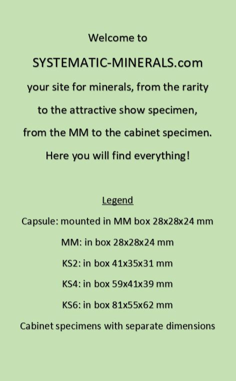 We have been collecting minerals for several decades and still maintain our own extensive collection. We would like to pass on our know-how in the form of a wide range of minerals to you. So we deal intensively with rare minerals and attractive specimens every day, in order to be able to offer them safely identified and visually appealing prepared for you. The specimens offered here also represent our own focus of our collecting passion. This concerns highly rare systematic minerals, beautiful cabinet specimens up to the bizarre speciality. Not only specific new acquisitions are offered to you here, but also parts of old collections as well as of the own collection. Thereby the service is close to our heart. Not only with a neat presentation and careful labeling, but also with fast shipping and the possibility to reach us personally, we are always at your assistance with words and deeds.