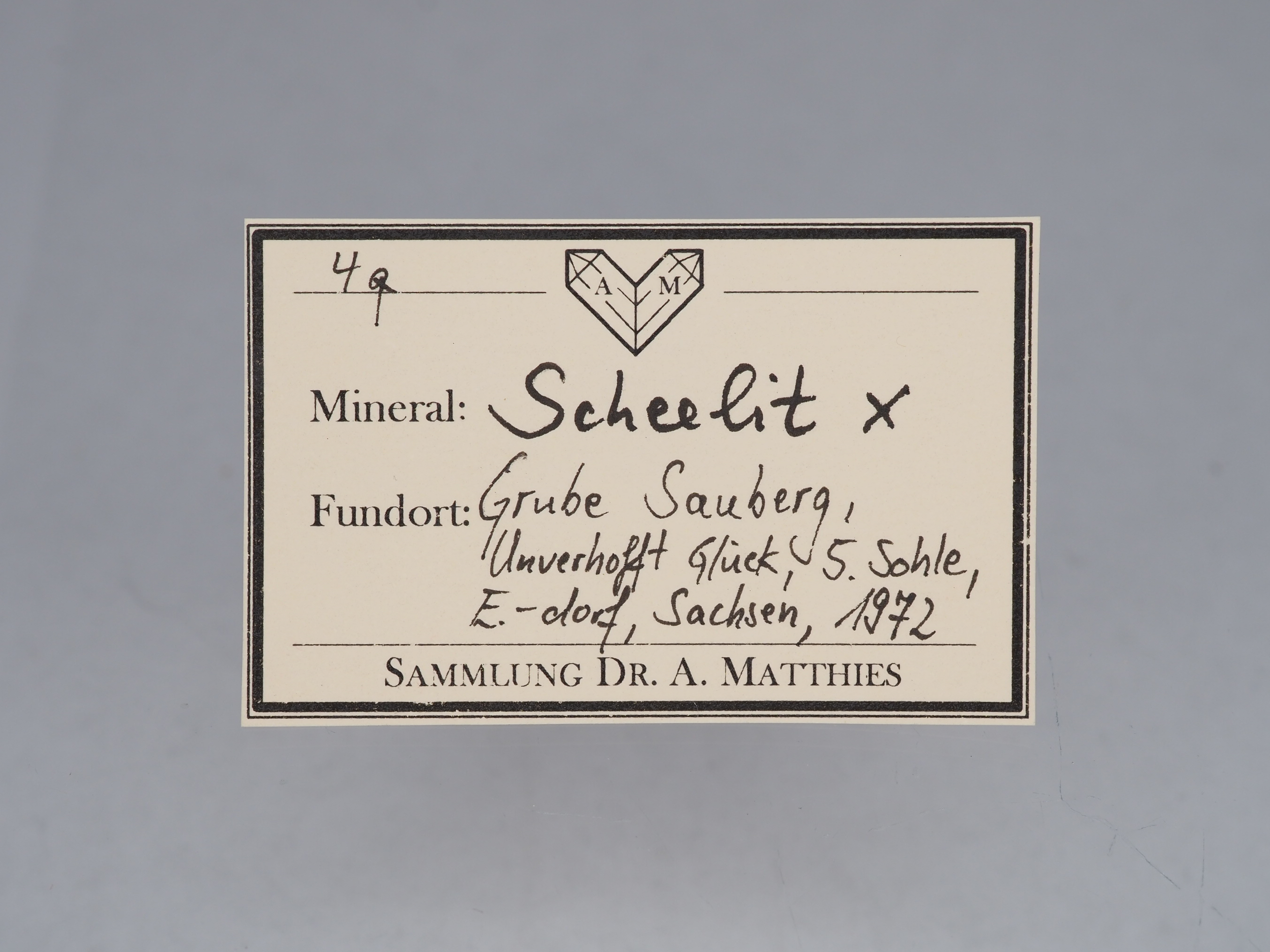 Rarität: Top und ausgesprochen großer Scheelit-Kristall von rund 2x1,5 cm. Absolute Rarität für diese Lagerstätte. Aus gepflegter alter Sammlung – der Kristall ist sorgsam auf einem Glassockel montiert. Mit gut dokumentierter Fundortangabe (siehe Sammlungsetikett). Klassiker und absolut rar!